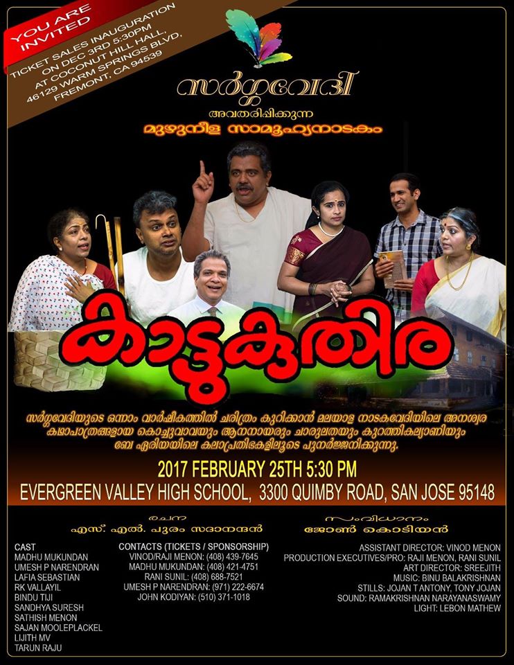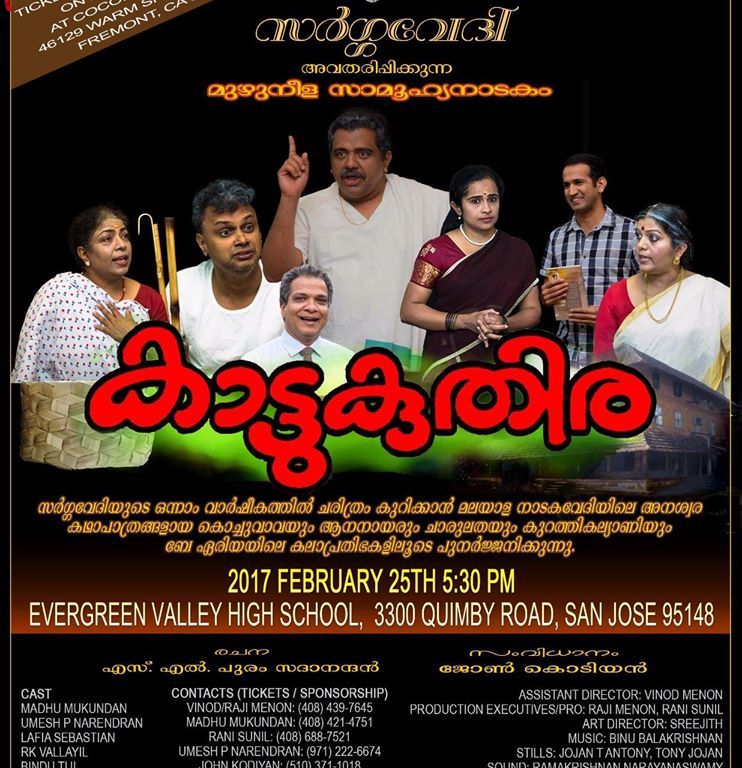 ഇങ്ങനെയൊരു ദൃശ്യ വിസ്മയം ബേ.ഏരിയ മലയാളികൾക്ക് കാഴ്ച്ച വച്ച സർഗ്ഗവേദിക്ക് എന്റെ അഭിന്ദനങ്ങൾ. ഇത് ഒരു തുടക്കമായി കൂടുതൽ മുഴുനീള നാടകങ്ങൾ വരട്ടെ എന്ന് നമുക്ക് ആശംസിക്കാം. മാത്രമല്ല ഈ കാട്ടുകുതിരയുടെ കുളന്പടികൾ അമേരിക്ക മുഴുവൻ കേൾക്കണം വേദിയിൽ നിന്നും വേദികളിലേക്ക് അത് നീങ്ങട്ടെ.