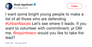 ഈ ട്വീറ്റിന്റെ ഭീകരാവസ്ഥ മനസ്സിലാവുന്നുണ്ടോ. ഈ ‘അർബൻ നക്സൽ’ എന്ന വാക്കിന്റെ ഉപജ്ഞാതാവ് ഈ വിവേക്ക് തന്നെയാണ്. അയാളുടെ അടുത്തിറങ്ങിയ പുസ്തകത്തിന്റെ പേരും ഇത് തന്നെ.