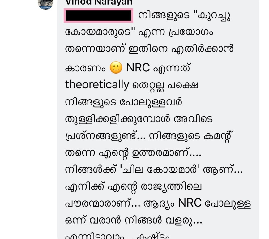 NRC യെ കുറിച്ചും പൗരത്വ ബില്ലിനെ കുറിച്ചുമുള്ള എന്റെ അഭിപ്രായം വളരെ ലളിതമാണ്… അത് ശരിയല്ല… കാരണം എന്നോട് ഒരാൾ ചോദിച്ച ഈ ചോദ്യത്തിലും അതിനുള്ള എന്റെ ഉത്തരത്തിലും അടങ്ങിയിരിക്കുന്നു… നിങ്ങൾ ബാക്കി സ്വയം ചിന്തിച്ചു കൊള്ളുക… എന്നോട് വന്ന ചോദ്യം: Vinod Narayan താങ്കൾ അമേരിക്കയിൽ ജീവിക്കുന്ന ഒരാൾ അല്ലേ ആ രാജ്യത്തെ കുടിയേറ്റക്കാരോട് ഉള്ള സമീപനം അമേരിക്കയുടെ എന്താണെന്ന് താങ്കൾക്കും അറിയാവുന്നതല്ലേ പിന്നെ എന്തിനാണ് എരിതീയിൽ എണ്ണ ഒഴിക്കുന്നത് നിങ്ങൾക്ക് കുറച്ചു കോയമാരുടെ കയ്യടി കിട്ടാൻ ആണെങ്കിൽ ഇത് വെറും മോശം പണിയായിപ്പോയി രാജ്യം നിൽക്കുമ്പോൾ മാത്രമാണ് ഒരു … Continue reading പൗരത്വ ബിൽ | NRC | മർത്ത്യലൊകം #37